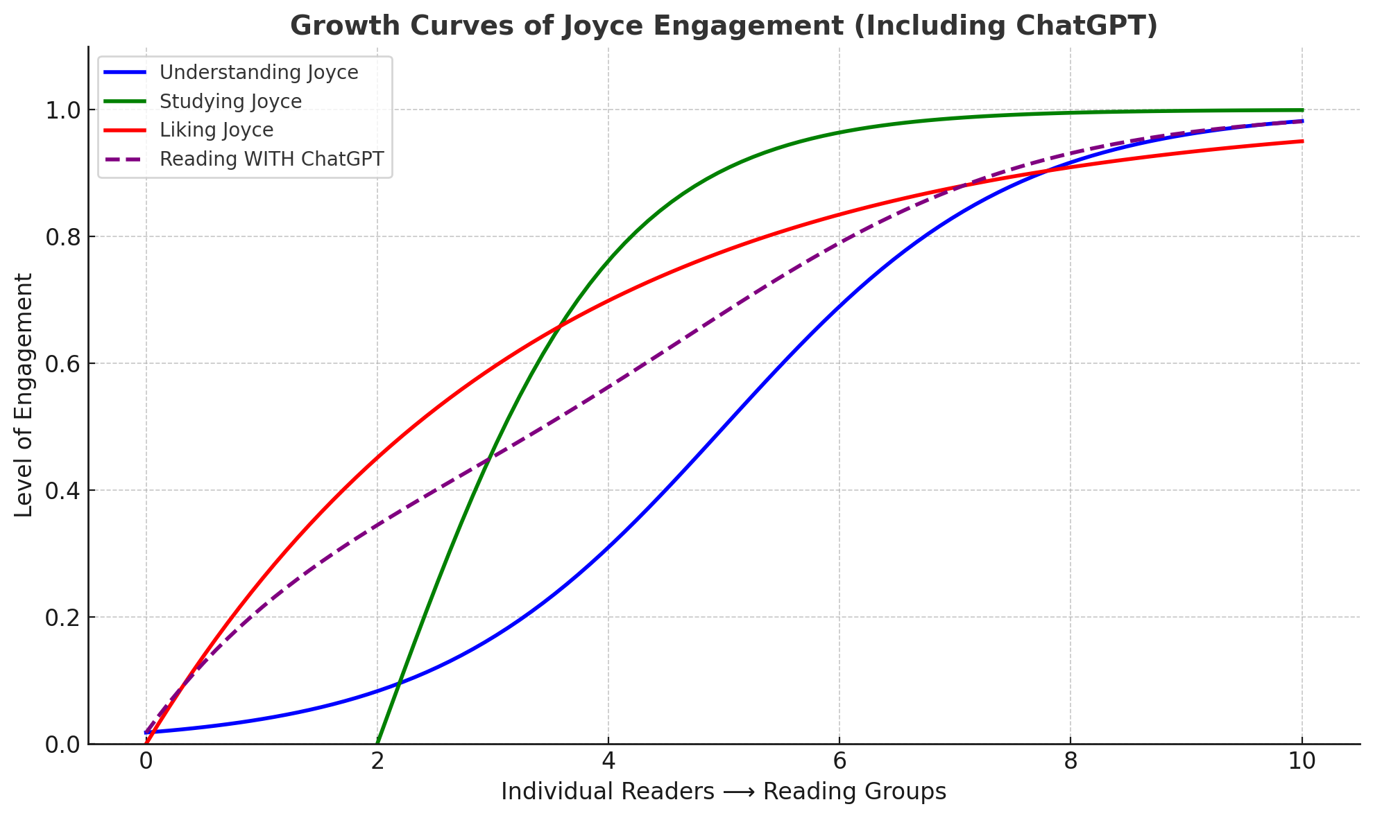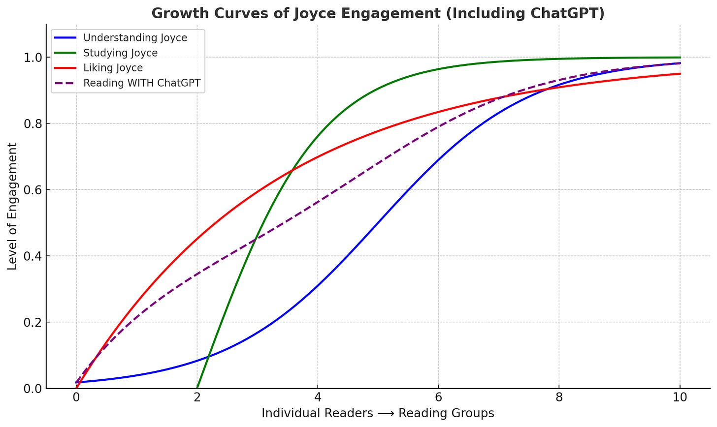 A Joyce Scholar "The inclusion of ChatGPT introduces a fascinating pedagogical intermediary—akin to a Socratic ghost in the machine. While group reading remains vital for wrestling with the polysemic density of Joyce's texts, this purple curve suggests a promising augmentation: personalized exegesis without the latency of traditional scholarship. Still, true understanding demands polyphony—inner and outer voices mingling, not just clarified syntax."