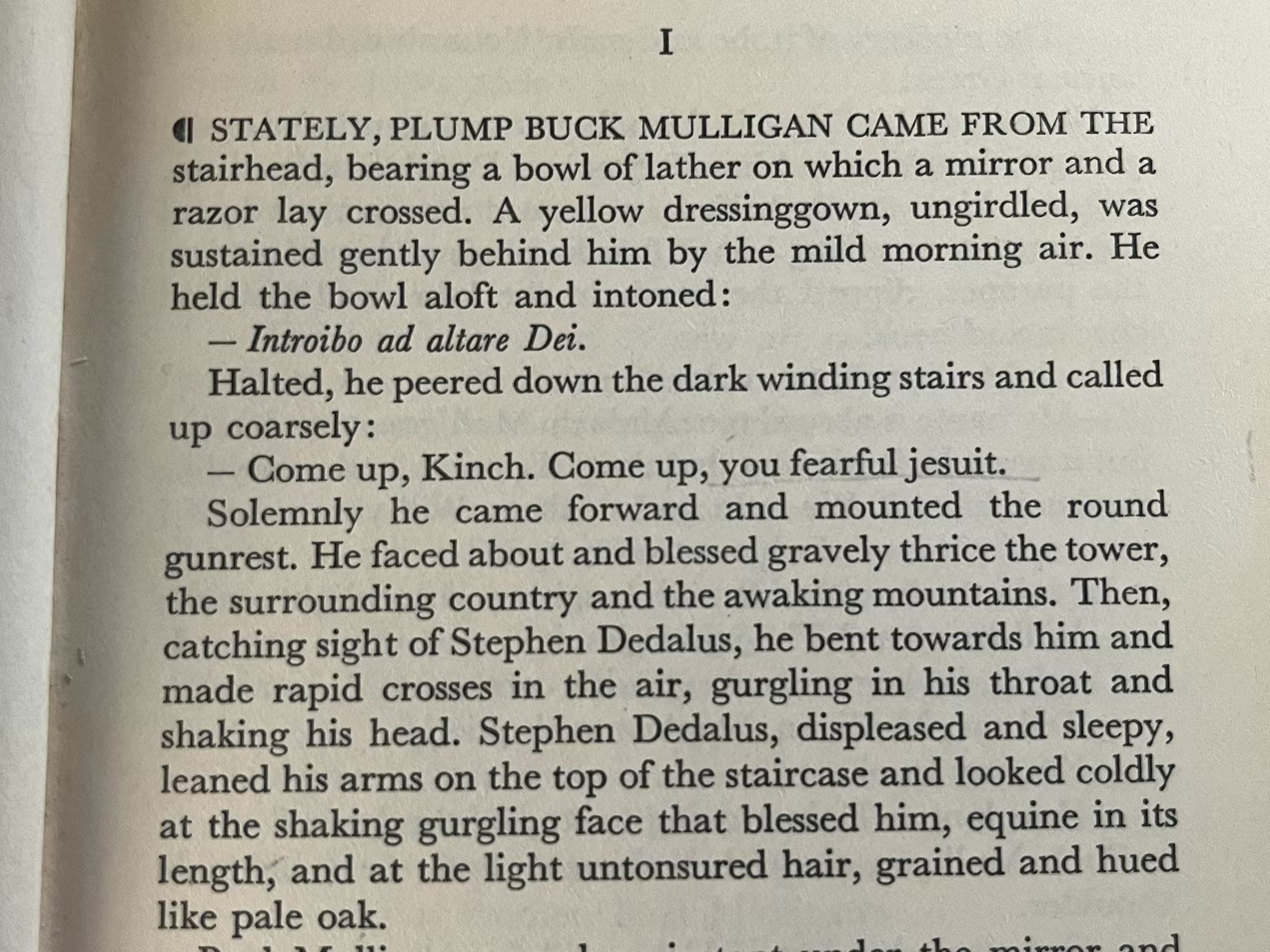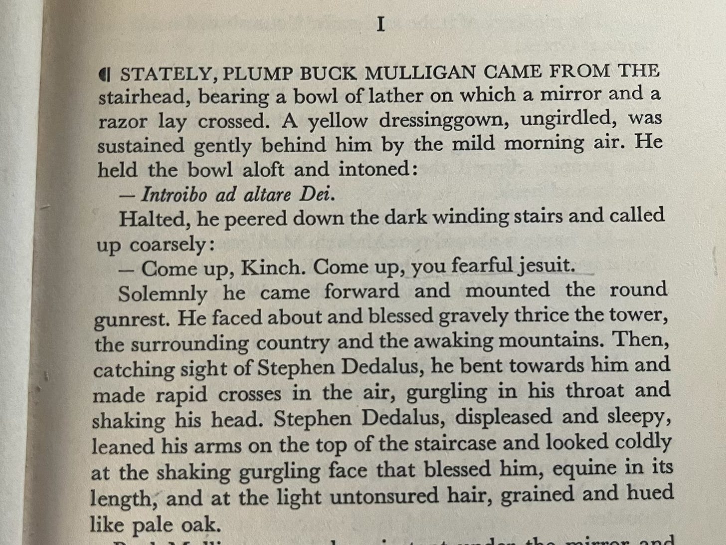 A Threat to the Self. Stephen, who watches all this, has no razor. He’s unshaven, underdressed, and spiritually raw. Mulligan’s razors are part of his control, his aesthetic. But for Stephen, that crossed razor could symbolize violence—not just bodily, but existential. Think of how Stephen later recalls his mother’s death and his refusal to kneel: his own inner conflict is full of sharp edges. So in four words—“a razor lay crossed”—Joyce draws a miniature: ritual + parody + danger + duality.